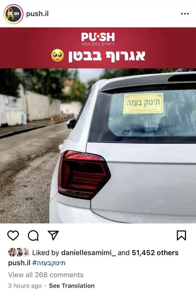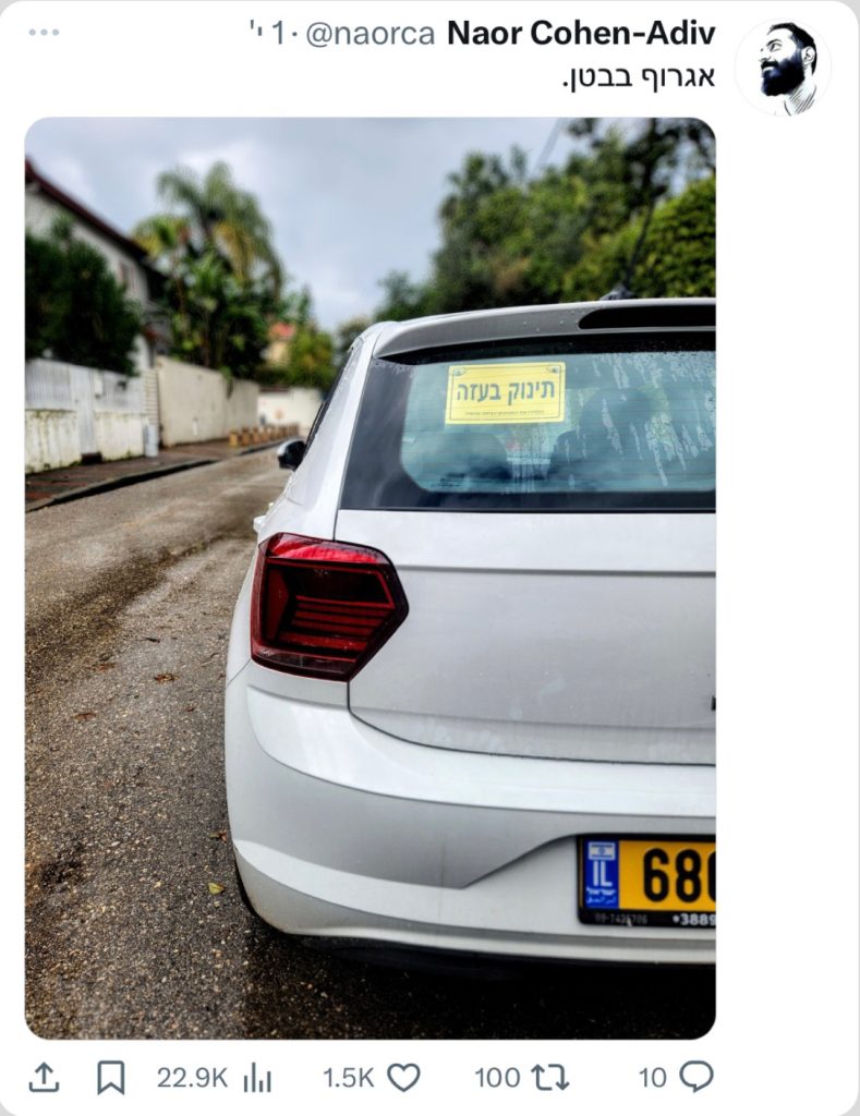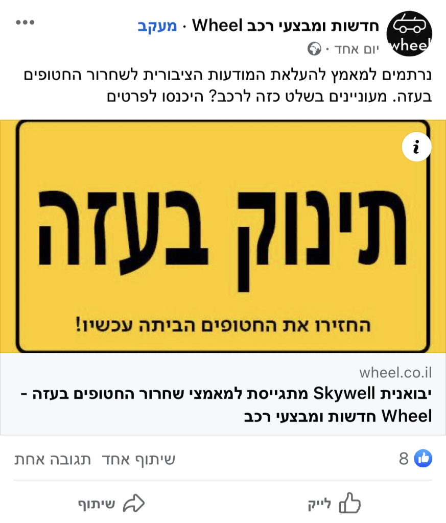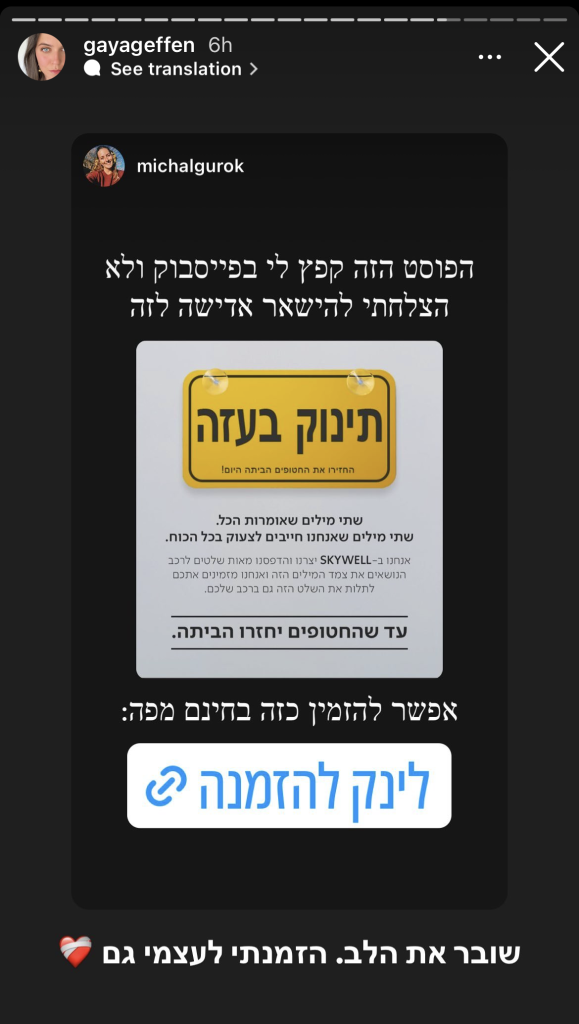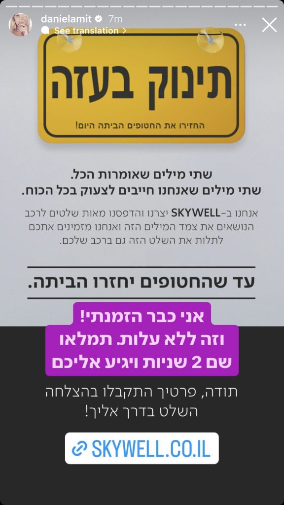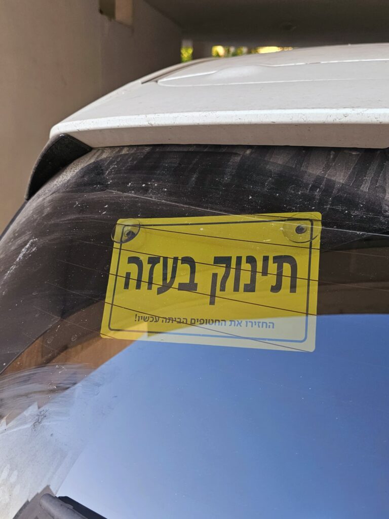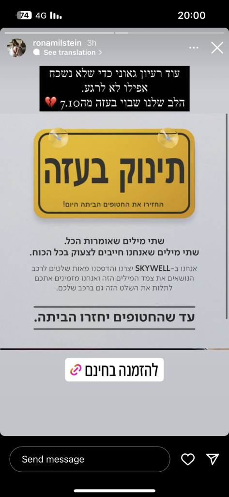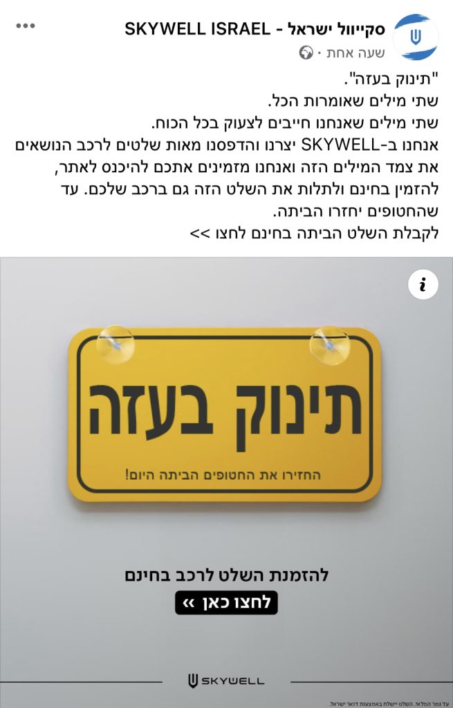 כחודש לאחר השבעה באוקטובר, מותג הרכב החשמלי SKYWELL יצא במהלך הקורא להשבת החטופים, באמצעות שינוי השלט המוכר "תינוק באוטו" ל"תינוק בעזה". 10,000 השלטים שהדפסנו וחילקנו בחינם אזלו תוך פחות מ-48 שעות, מאז צצו עוד ועוד גרסאות של השלט הזה אשר נועדו להפוך את הרכבים בישראל לתזכורות ניידות וקריאה ברורה להשבת החטופים.