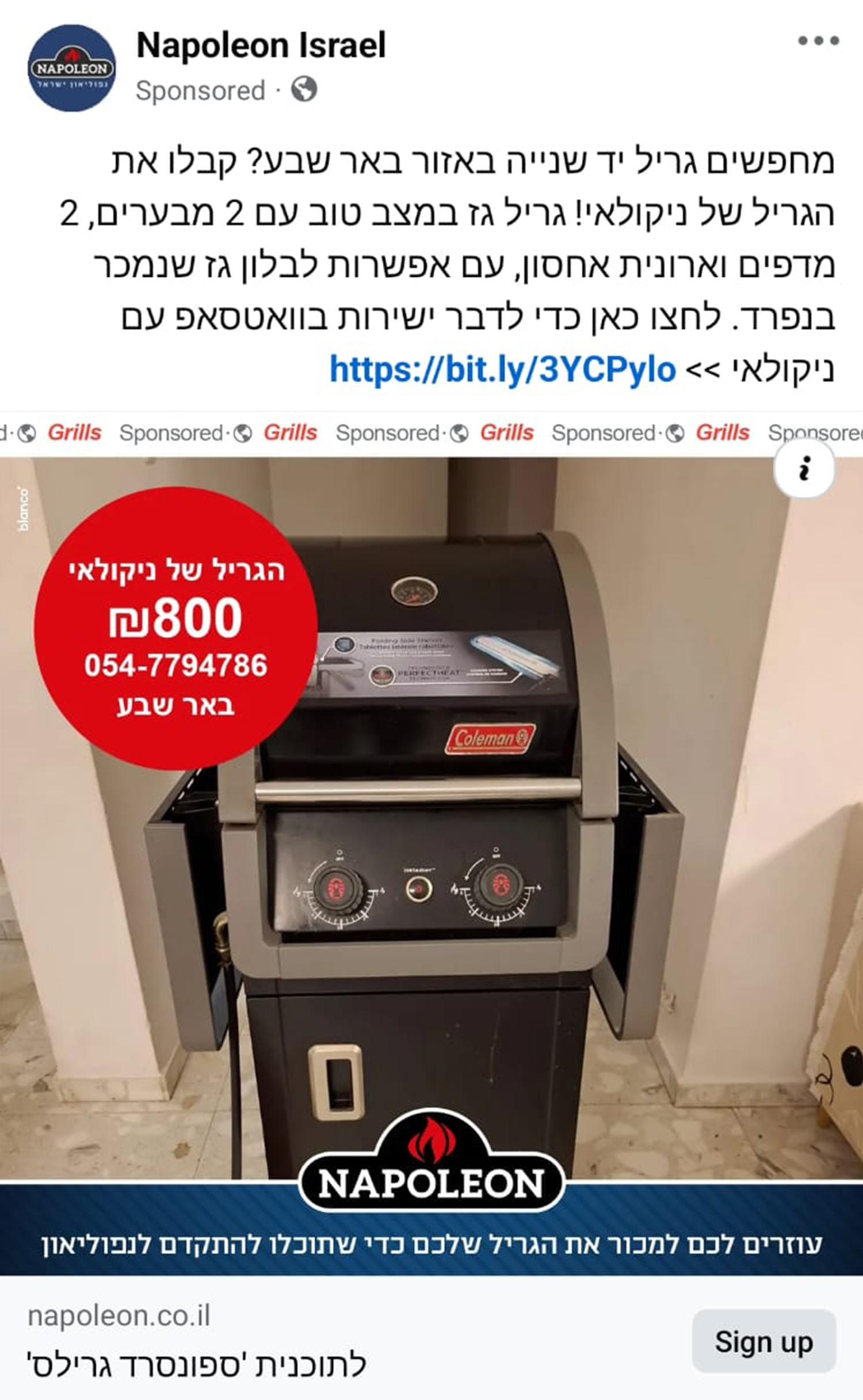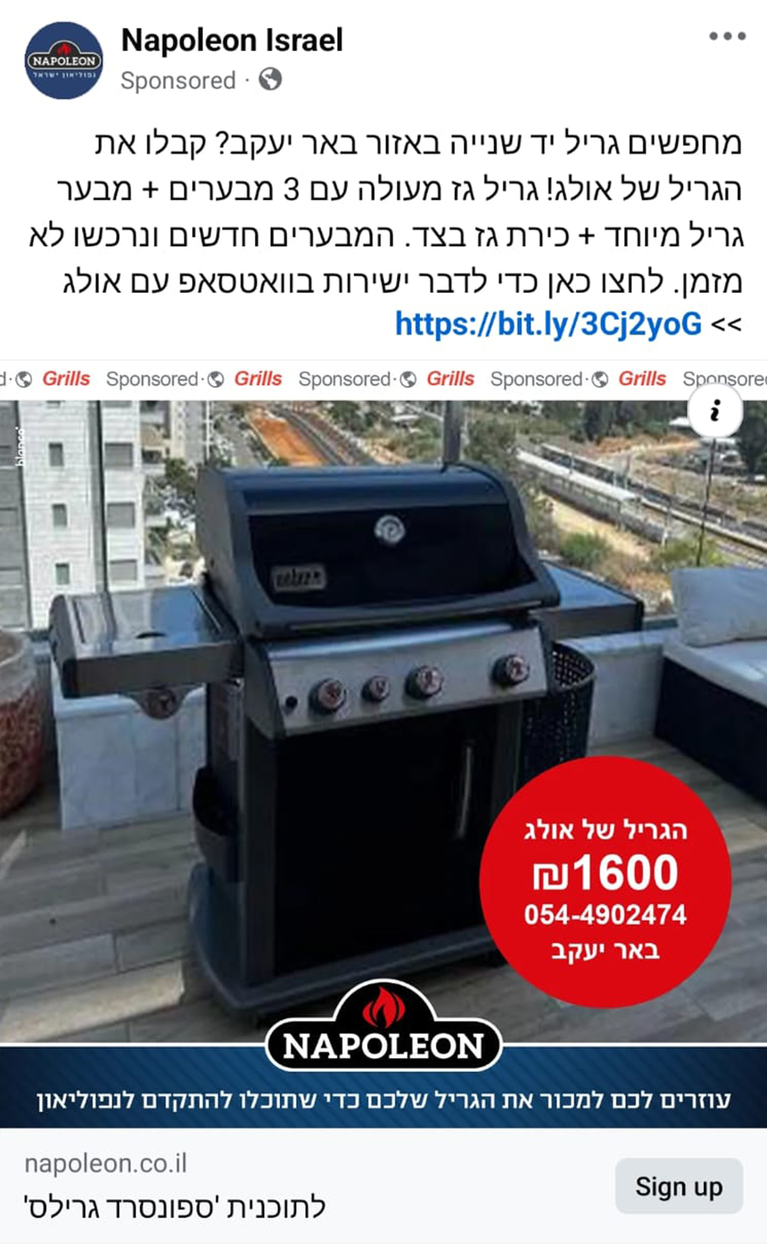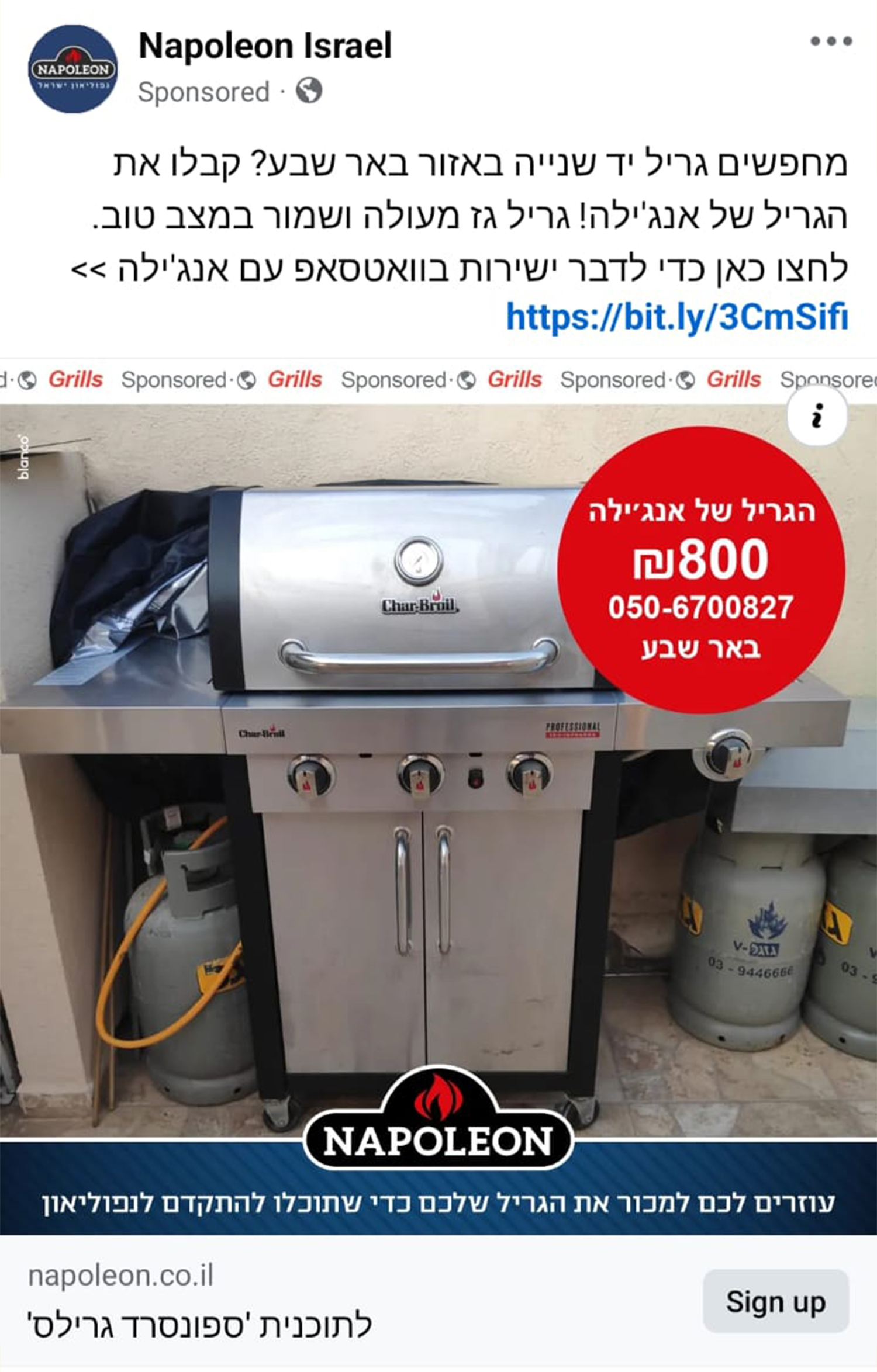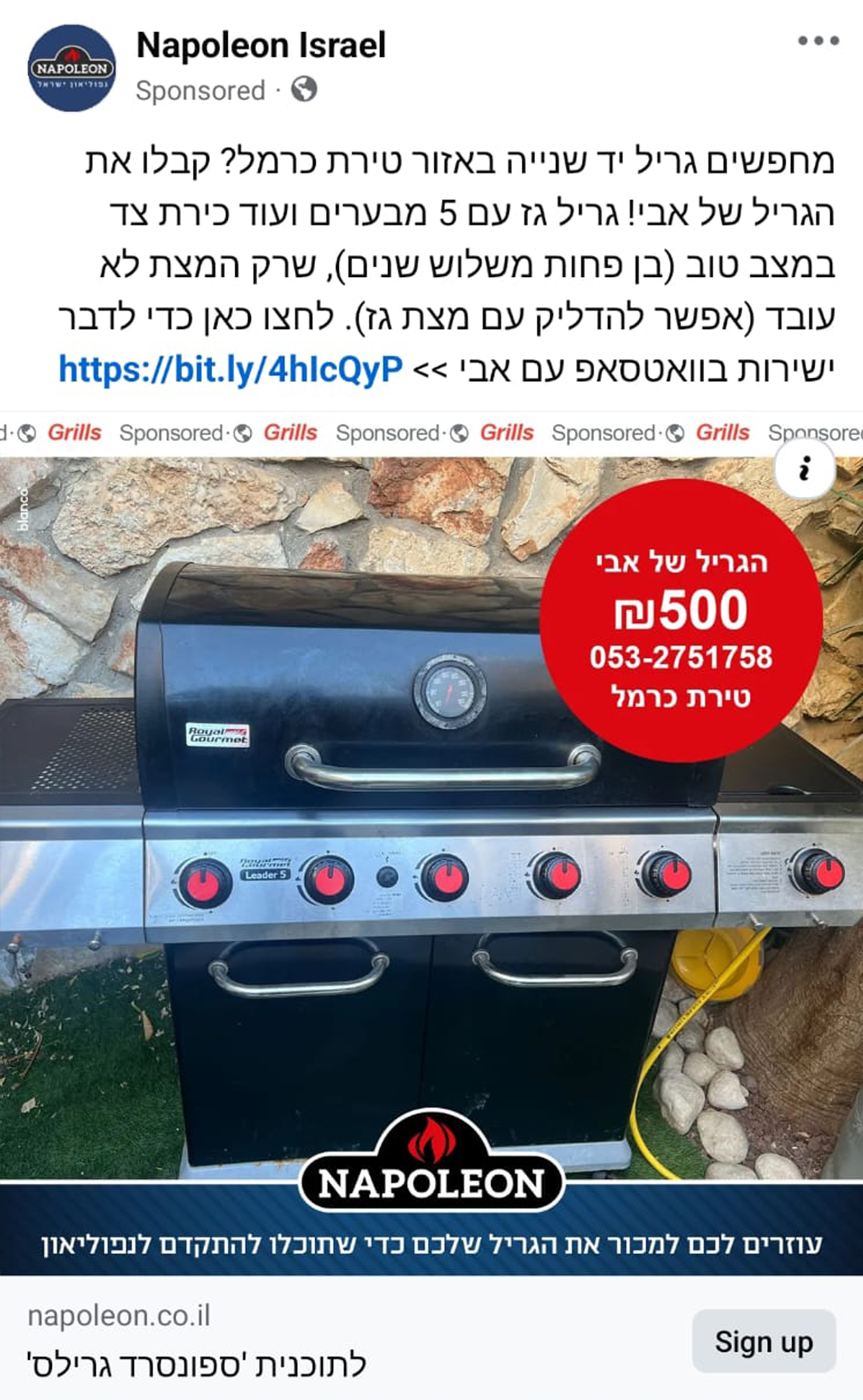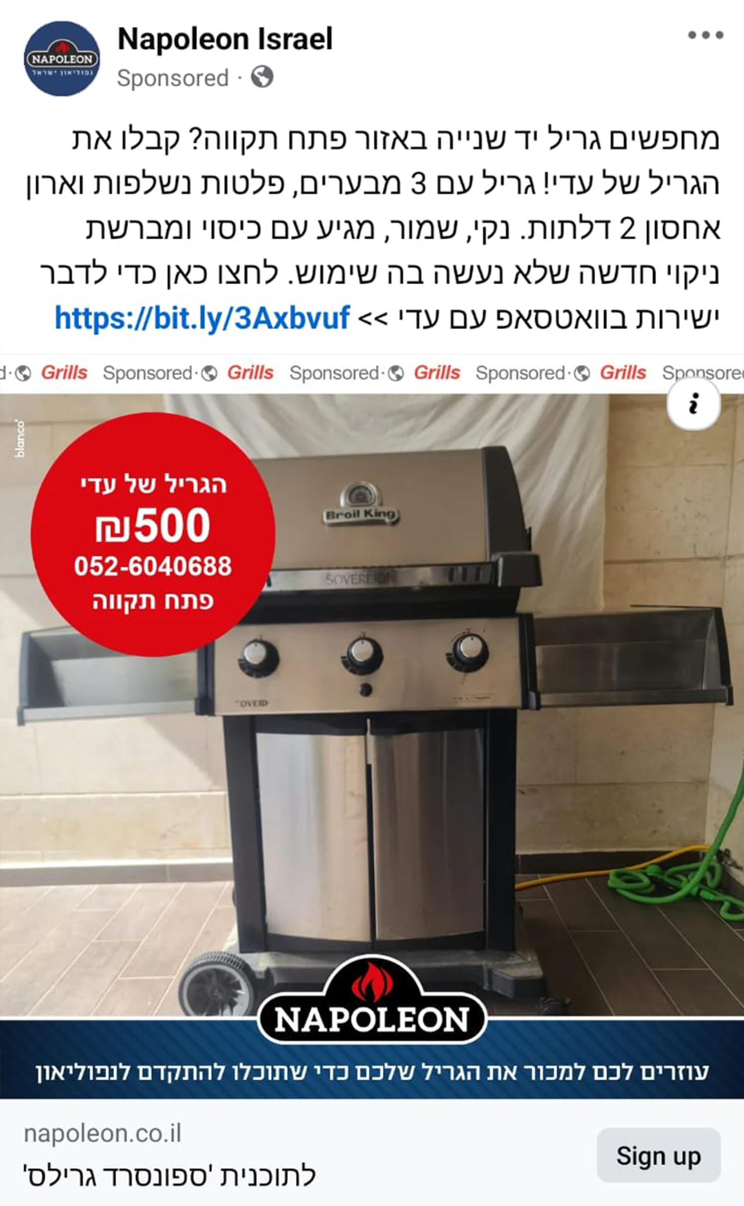נפוליאון הוא מותג הגרילים הנמכר בישראל ובקטגוריה עם מגבלה חוקית על טרייד אין, פיתחנו דרך יצירתית כדי להגדיל נתח שוק. המרקטפלייס ולוח יד 2 מלאים באנשים שמוכרים את הגריל שלהם אז במקום לחכות שהם ימכרו את הגריל שלהם החלטנו לעזור להם – בכדי שיתקדמו לגריל שלנו. עלינו בקמפיין וביקשנו מהמוכרים לשלוח את פרטי הגריל שלהם לוואטסאפ ייעודי שהקמנו – ויצרנו לכל מוכר מודעה אישית ממומנת בפייסבוק. בפעם הראשונה בתולדות המותג, השקענו את תקציב הפרסום של נפוליאון לטובת קידום מכירות של גריל מתחרה – יד שנייה. באמצעות הקמפיין, יצרנו דאטה של מוכרי גרילים ולהם הגשנו קמפיין רימרקטינג עם קופון הנחה לרכישה של נפוליאון.
